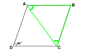 Triangle ABC is isosceles since line segment AB is congruent to line segment BC. Then we can say that the base angles of triangle ABC must be congruent or equal. Since we know the diagonal bisects the angles A and C, we must have two congruent triangles here. If so, then the measure of angle D = the measure of angle B = 60 degrees.