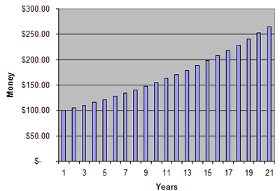Here is a graph showing what happens to $100 invested at 5% interest for 20 years: