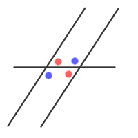 If two lines are cut by a transveral, pairs of angles between the two lines and on opposite sides of the transversal are called alternate interior angles. Alternate interior angles have the same measure, and examples are shown in the color-coded image below: