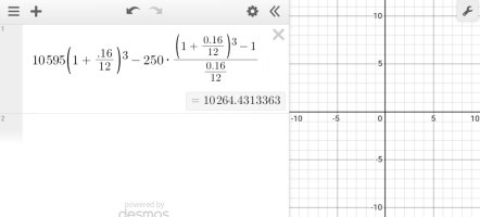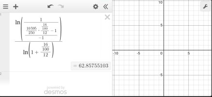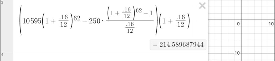 \(\displaystyle 10595\left(1+\frac{0.16}{12}\right)^{x}-250\left[\left(1+\frac{0.16}{12}\right)^{x}-1\right]\frac{12}{0.16}=0\)