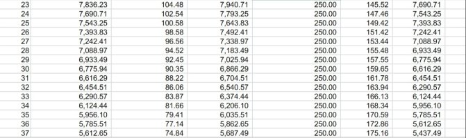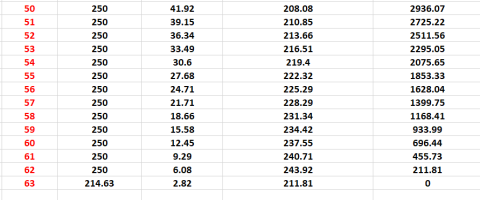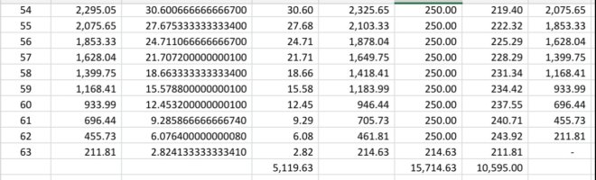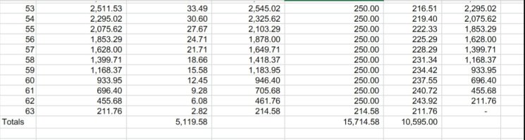 The negative sign in the \(\displaystyle 63^{\text{rd}}\) month confirms that a partial payment will be paid in that month. So, yes we have the same sheets, except mine is not organized as yours. Also, I have not shown all the months!