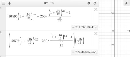But you did not round them to the nearest cent! Look the End Balance in the month \(\displaystyle 62\), it is \(\displaystyle 211.76613943\).