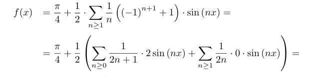 \(\displaystyle \sum_{n=1}\frac{(-1)^{n+1} + 1}{n}\sin nx\)