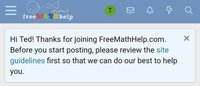 FYI -- Ted has added an announcement to the forum's front page, directing new users to read the forum's guidelines. This announcement appears for all new members with fewer than five posts, unless they dismiss the announcement. Once dismissed, the announcement will not appear for that member again.