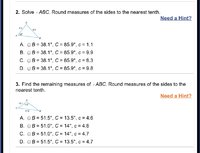 For #1, First calculate [a/sin(A)] - then calculate angle B from there .... and continue....