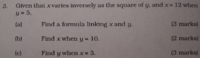 Google can help you find the "varies inversely" formula. It involves a constant. Plug in the 2 given values to find the constant. This answers a. Then use the formula to answer b and c.I have no idea what this question means and no idea where to begin.View attachment 25112