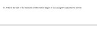 The sum of the measures of the interior angles of an n-gon is (n-2)*180. A dodecagon or 12-gon is a twelve sided polygon, with 12 interior angles.