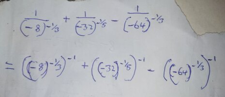 [imath]\begin{array}{cc} \frac{ 1 }{( - 8 ) ^ {( - \frac{ 1 }{ 3 })}} + \frac{ 1 }{( - 32 ) ^ {( - \frac{ 1 }{ 5 })}} - \frac{ 1 }{( - 64 ) ^ {( - \frac{ 1 }{ 3 })}} \\[8pt] = \left( ( - 8 ) ^ {( - \frac{ 1 }{ 3 })} \right) ^ {( - 1 )} + \left( ( - 32 ) ^ {( - \frac{ 1 }{ 5 })} \right) ^ {( - 1 )} - \left( ( - 64 ) ^ {( - \frac{ 1 }{ 3 })} \right) ^ {( - 1 )} \end{array} [\imath][/imath]