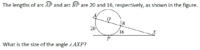 Because the line \(\displaystyle \overleftrightarrow {XP}\) is a tangent to the circle \(\displaystyle O\) so the the angle tex]m(\algleOPX)=\frac{\pi}{2}[/tex] or a right angle. Now consider \(\displaystyle angle POB\) intercepts an arc of length \(\displaystyle 16\), Can ypu use \(\displaystyle \frac{36}{180^o}=\frac{16}{m(\angle POB)}\) to show that \(\displaystyle m(\angle POB)=80^o\) so \(\displaystyle m(\angle PXB)=10^o\).