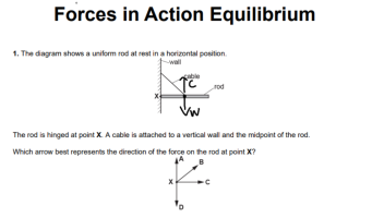 The only force being applied to the rod is due to Gravity which is being represented by the arrow marked "W".A bit confused about what section to put this under but I really don't understand how the answer is C, does direction of the force mean the net force of weight and cable? or just cable? is the wall doing anything...? I thought the answer was A to balance it out View attachment 37341