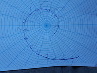 Apologies for a botched first attempt on the same page, but this example spiral is starting with an initial radius of 1.25 inches (polar grid radius is divided into 1/4" units) and then I used a compass to draw the chord (approximating arc length) by seeing where the 1" compass line intersected the radius grid for a next radius value of (1.25)*1.1^n (nth chord). I described this as growing proportionally but I think I should have said exponentially, my mistake.