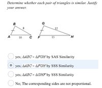 Okay I understand that. AB: FG do not have the same ratio. Thank you!\(\displaystyle \frac{BC}{GH}=\frac{8}{12} =\frac{2}{3}\)