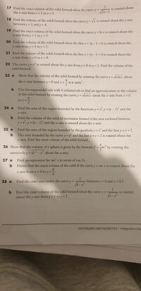 24 b The area bounded by the curve [imath]y=x^2[/imath] and the line [imath]y=x+2[/imath] is rotated about the [imath]x[/imath]-axis. Find the exact volume of the solid formed.