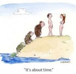 If you are asking, "what is the point of this cartoon", it is that women have always been evolved and mature while men are just catching up. It is pretty much the opposite of your "blah, blah, blah", bathroom door, cartoon.