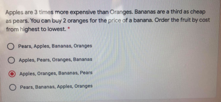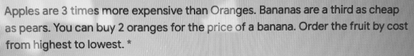Apples are 3 times more expensive than oranges → A > O ....... and continue