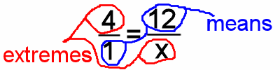 To solve a proportion like this, we will use a procedure called cross-multiplication. This process involves multiplying the two extremes and then comparing that product with the product of the means. An extreme is the first number (4), and the last number (x), and a mean is the 1 or the 12.